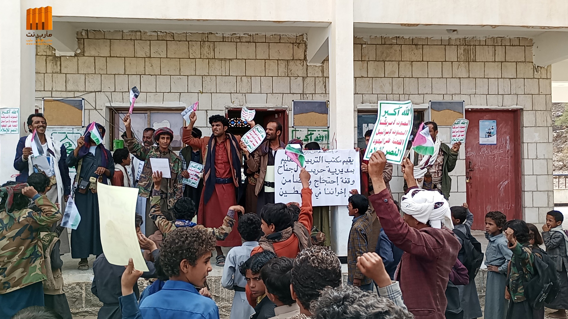 أقيمت بمدرسة معشراء بمنطقة آل جناح بمديرية حريب بمأرب اليوم وقفة طلابية، تنديدا بجرائم الكيان الصهيوني في قطاع غزة.