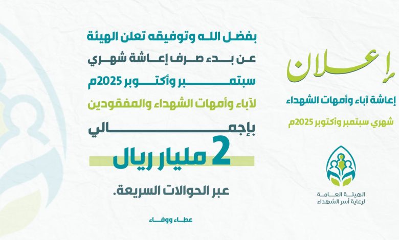 أعلنت الهيئة العامة لرعاية أسر الشهداء عن صرف  مشروع إعاشة آباء وأمهات الشهداء  والمفقودين لشهري سبتمبر واكتوبر للعام 2025م  ابتداء من صباح اليوم الأربعاء 22اكتوبر 2025م  .