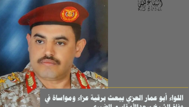 وجدد البيان، العهد والوفاء للشهداء الأبرار والشهيد القائد الجهادي الكبير رئيس هيئة الأركان الفريق الركن محمد الغماري، بالسير على نهجهم والجهاد في سبيل الله ومواجهة كل مساعي الأعداء ومخططاتهم الرامية الى استباحة المنطقة .