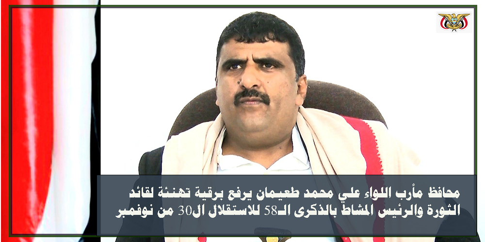 رفع محافظ مأرب اللواء علي محمد طعيمان برقية تهنئة إلى قائد الثورة السيد عبد الملك بدر الدين الحوثي، وفخامة المشير الركن مهدي المشاط رئيس المجلس السياسي الأعلى وأعضاء المجلس وأبناء الشعب اليمني، بمناسبة العيد الوطني للاستقلال الـ 30 من نوفمبر.