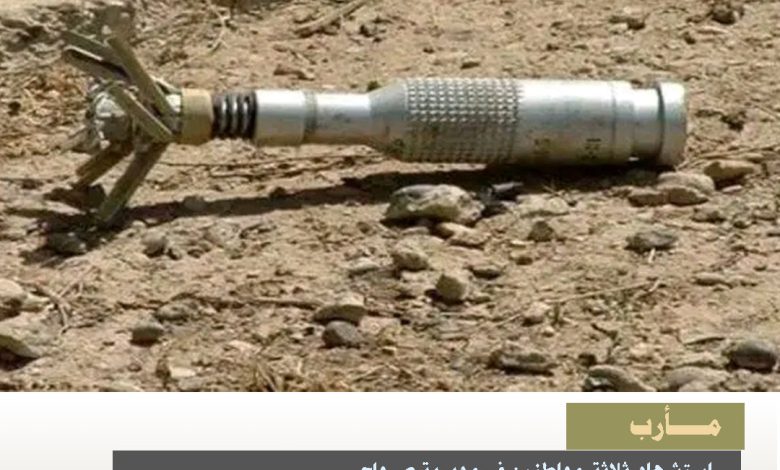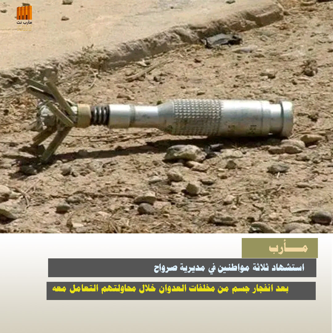 استشهد ثلاثة مواطنين اليوم بانفجار جسم من مخلفات العدوان في مديرية صرواح بمأرب.