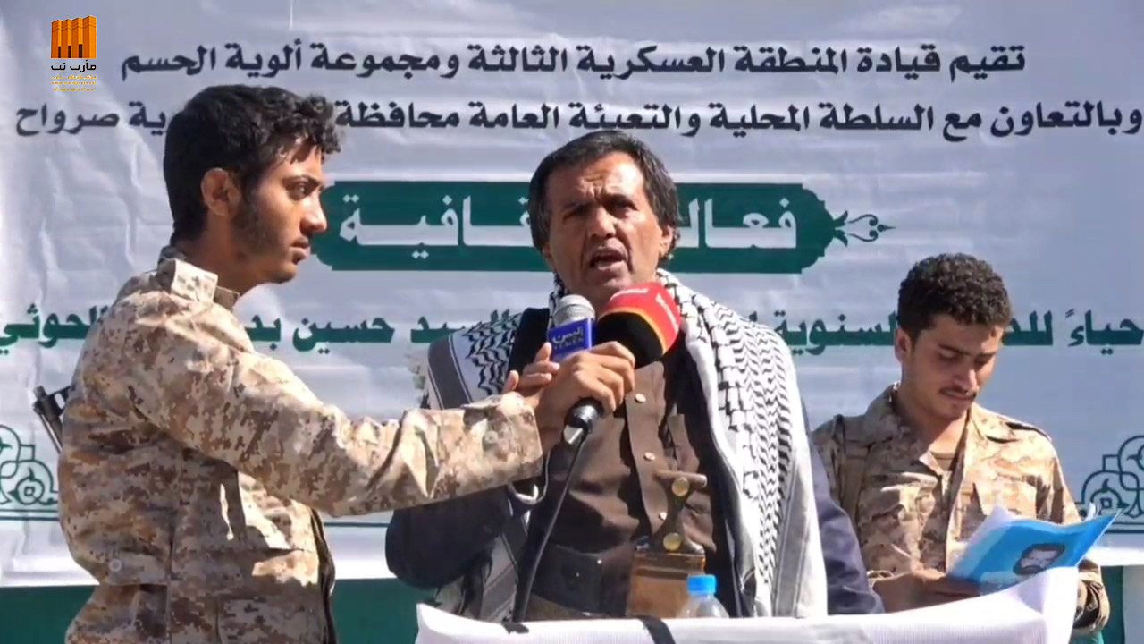 حيث نظمت المنطقة العسكرية الثالثة وألوية الحسم والسلطة المحلية والتعبئة العامة فعالية خطابية في مديرية صرواح، بحضور مدير المديرية مرعي العامري وقيادات محلية وتعبوية وعسكرية، أكدت كلمات المشاركين فيها أهمية الذكرى في استلهام الدروس والعبر من سيرة الشهيد القائد ومشروعه القرآني.