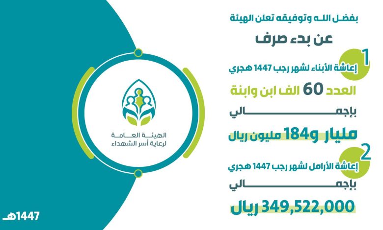 بإجمالي مليار و533 مليون ريال.. صرف إعاشة أبناء الشهداء والمفقودين وأرامل الشهداء وزوجات المفقودين لشهر رجب 1447هـ