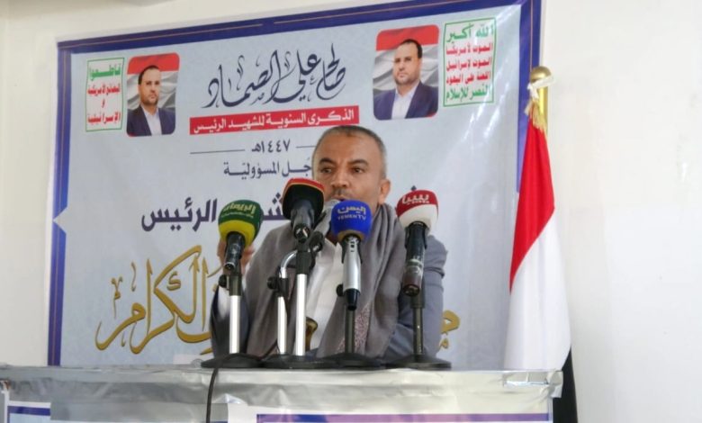 وتطرق إلى أهمية استشعار المسؤولية تجاه المبادئ والقيم التي جسدها الشهيد الرئيس من خلال مشروعه النهضوي “يد تحمي.. ويد تبني”، ودوره البارز في بناء مؤسسات الدولة وتعزيز القدرات الدفاعية وتوحيد الصف الوطني.. مؤكدا الاستمرار في العمل بروح المسؤولية والجهاد والبناء.