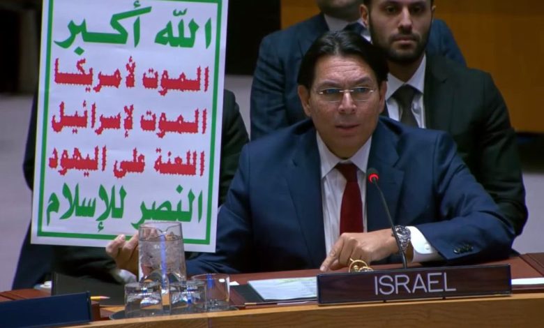 مشهد يعكسُ حجم الإرباك الذي يعيشُه كَيانُ الاحتلال، رفع مندوبه لدى الأمم المتحدة، داني دانون، مساء الأربعاء، لافتةً ضخمةً تحملُ “الصرخة” الشعار الشهير لأنصار الله خلال جلسة مجلس الأمن الدولي.