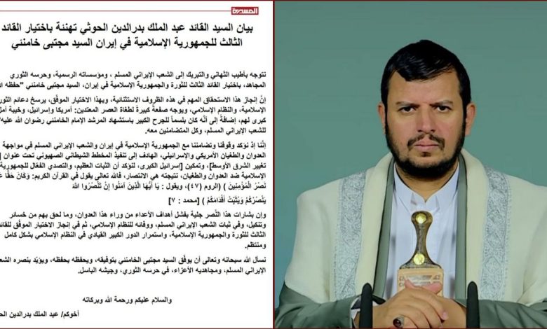 هنأ السيد القائد عبد الملك بدر الدين الحوثي، الشعب الإيراني ومؤسساته الرسمية وحرسه الثوري باختيار القائد الثالث للثورة والجمهورية الإسلامية في إيران السيد مجتبى خامنئي.