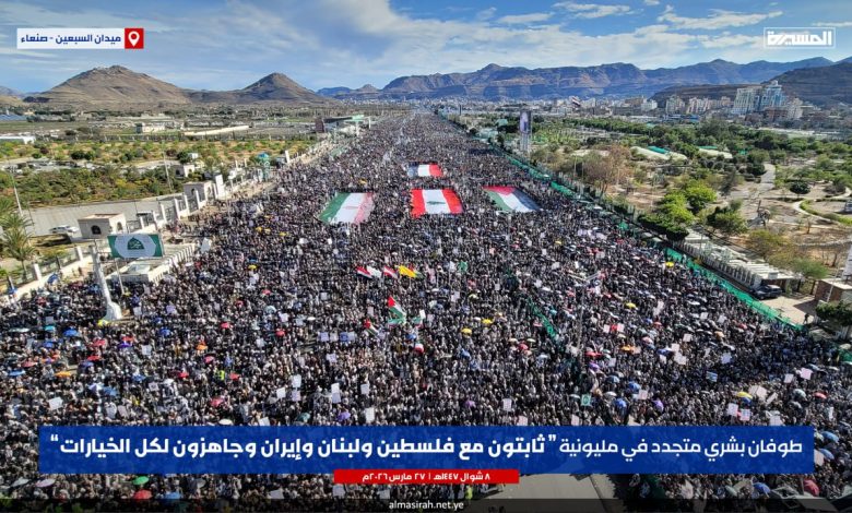 ميدان السبعين بصنعاء يحتضن مسيرة مليونية تحت شعار “ثابتون مع فلسطين ولبنان وإيران.. وجاهزون لكل الخيارات”