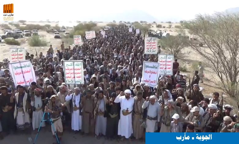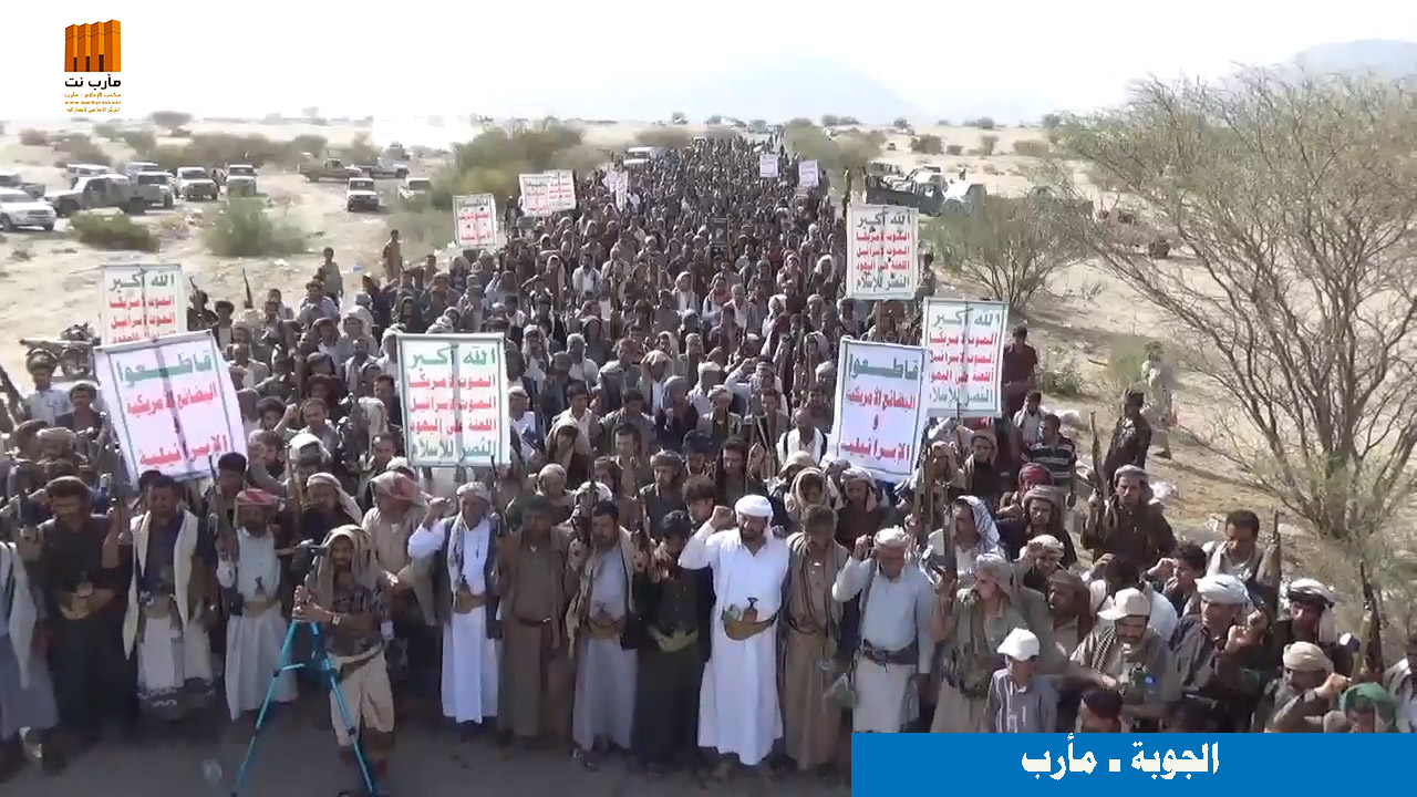 حيث شهدت ساحة الجوبة مسيرة جماهيرية لأبناء المربع الجنوبي بحضور محافظ مأرب اللواء علي محمد طعيمان ومسؤول التعبئة العامة العميد بدر المجش ، بارك االمشاركون فيها قرار القيادة الثورية والقوات المسلحة بالمشاركة العسكرية في هذه الجولة ضمن محور الجهاد والمقاومة لمواجهة مشروع مايسمى باسرائيل الكبرى.