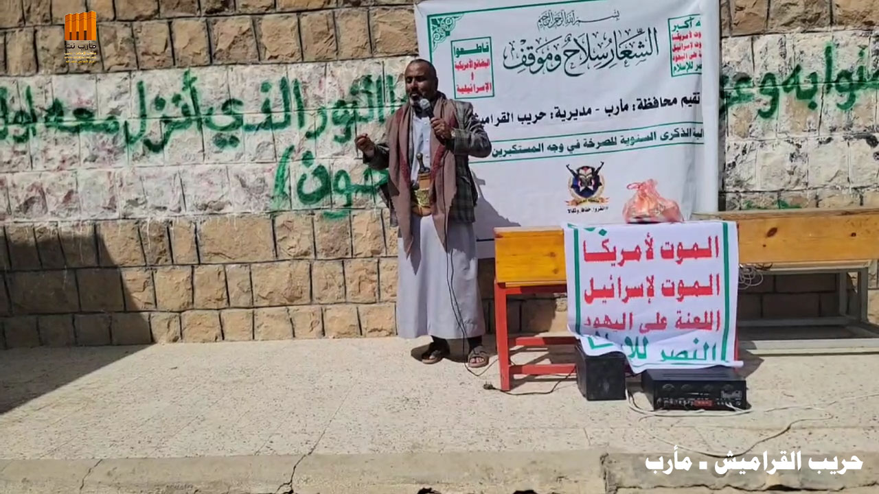 شهدت مديريات صرواح وبدبدة وحريب القراميش وجبل مراد ورحبة بمحافظة مأرب اليوم فعاليات خطابية متفرقة إحياء للذكرى السنوية للصرخة تحت شعار ” الشعار سلاح وموقف” .